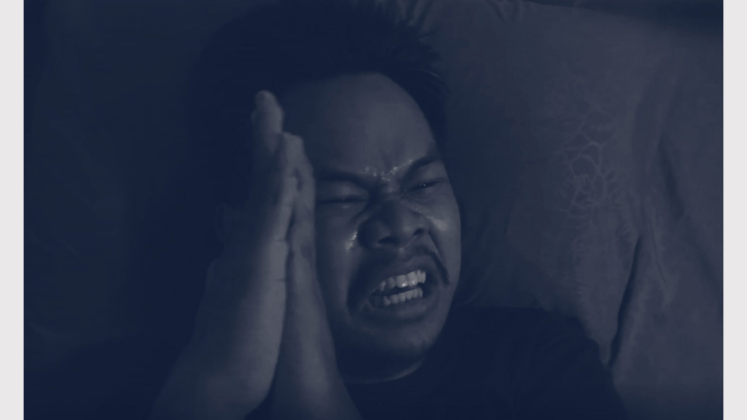 Gambar kemudian beralih. Sebuah kamar yang acak-acakan dengan pencahayaan yang temaram. Di ruang yang minim cahaya itu, di dindingnya tampak terpampang karya grafis cukil. Di meja yang sekaligus menjadi rak buku, di atasnya terdapat beberapa buah buku. Di samping rak tersebut, seorang laki-laki tidur dengan nyaman, penuh dengan igauan, dan dapat dipastikan bahwa ia mengalami mimpi yang begitu buruk. Ia merintih: “Sakit, sakit, sakit…,” sambil melindungi wajah dan tubuhnya. Kata itu diucapkannya berulang-ulang.