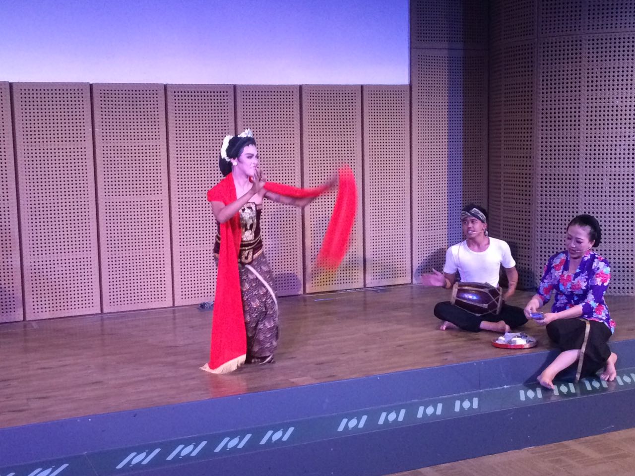 Ruang dingin dengan cahaya terang benderang itu terpecah keheningannya, oleh suara gaduh yang muncul dari sisi kanan panggung. Seorang perempuan bersanggul dengan hiasan melati, tubuhnya dibalut kain panjang dan kemben, bahunya ditutup selendang panjang warna merah. Ia berjalan diikuti wanita berkain panjang, berkebaya dengan motif bunga-bunga warna ungu-biru-merah cerah, yang membawa semacam nampan bulat kecil. Ada juga seorang lelaki memakai udeng (topi khas Jawa) membawa kendang kecil yang dikalungkan di tubuhnya. Ketiganya tidak memakai alas kaki. Mereka ramai memasuki panggung, berceloteh dalam bahasa Jawa Banyumasan bercampur bahasa Indonesia, menyatakan kekagumannya pada Jakarta, sekaligus keterkejutannya melihat penonton.
